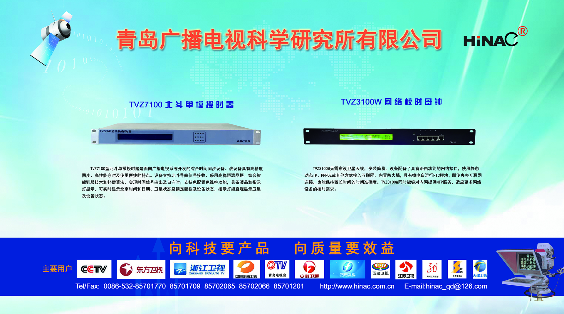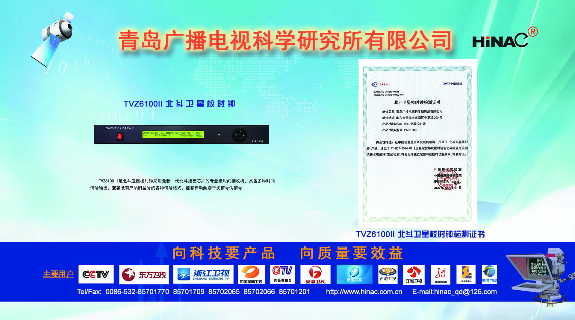25年不悔的執著追求! 25年不懈的專業堅持! 青島廣播電視科學研究所有限公司(簡稱青島廣電所)以其對廣電科技事業無限的熱愛,以及為爭做中國最優秀廣電產品供應商的美好理想,25年如一日,深耕廣電設備這塊沃土,已經形成且被市場高度認可的成果有: TVZ系列GPS/北斗自動校時鐘系統 TC系列電視播音提詞器及電視直播系統整體解決方案 TL系列泰麗訊源指示系統 QD系列搶答表決評分系統 IC系列廣電一卡通管理系統 同時向:廣電設備集成商、地鐵輕軌信號系統設備供應商及其它業務方向創新、拓展、前行! 青島廣電所在國家廣電傳媒事業不斷發展的今天,愿意和您攜手并進,為我們共同的事業發展添磚加瓦開拓創新。愿意和您一道,把工作中的一個奇思妙想轉變為一項偉...